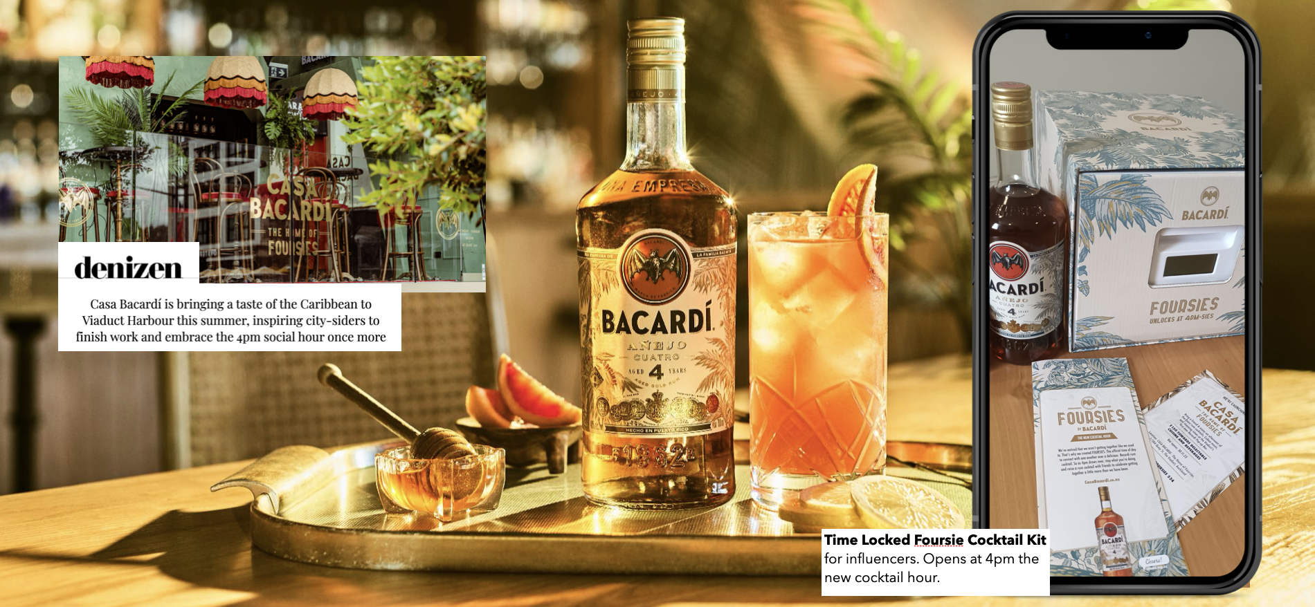 To encourage online engagement influencers were sent a Bacardi 4 cocktail kit, so they can make the Foursies cocktail at home. But there was a catch, the influencer box was time locked and only opened at 4pm the new cocktail hour.